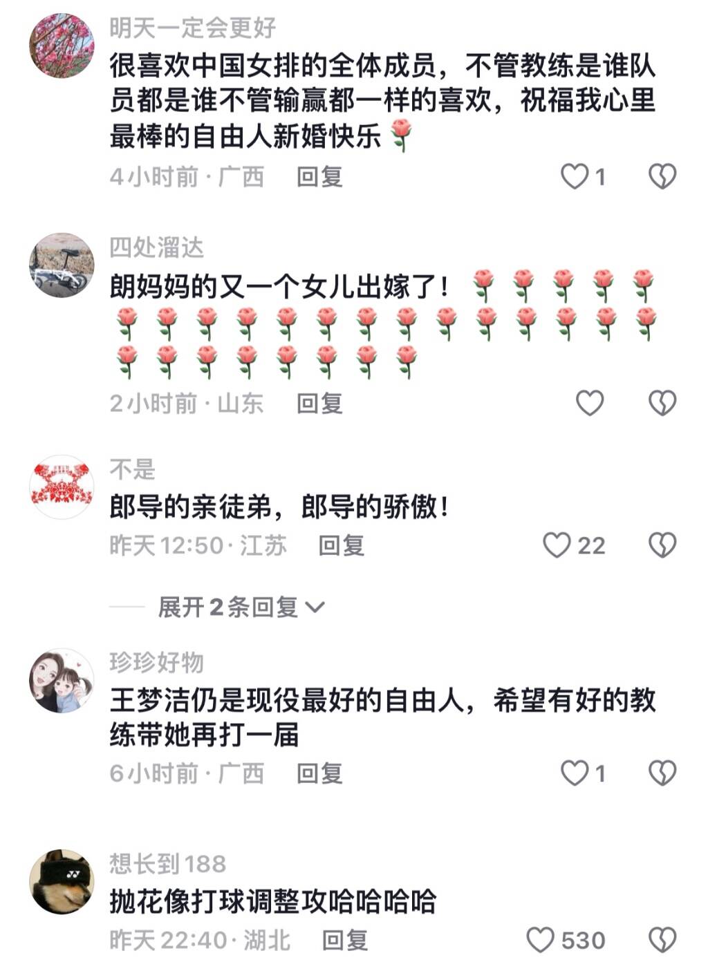 中國女排運動員惠若琪、張常寧紛紛在社媒上發布婚禮vlog,並送上祝福,網友們紛紛留言祝福這對新人,“很喜歡中國女排的全體成員,不管教練是誰隊員都是誰不管輸贏都一樣的喜歡,祝福我心裏最棒的自由人新婚快樂。”