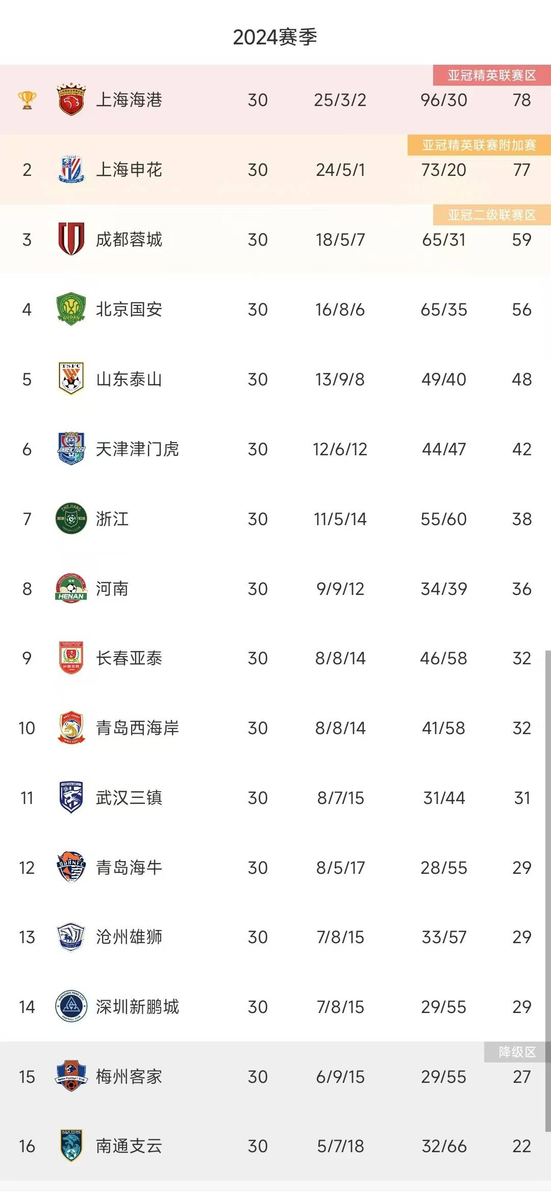 齊魯網·閃電新聞11月4日訊 閃電體育消息,日前,2024賽季中超落下帷幕,上海海港如願衛冕中超冠軍,上海申花獲得亞軍,成都蓉城獲季軍。除此之外,北京國安獲得第四,山東泰山隊最終位列第五位,梅州客家和南通支雲降入中甲。青島海牛、滄州雄獅、深圳新鵬城三隊位列第12到第14名,成功保級。