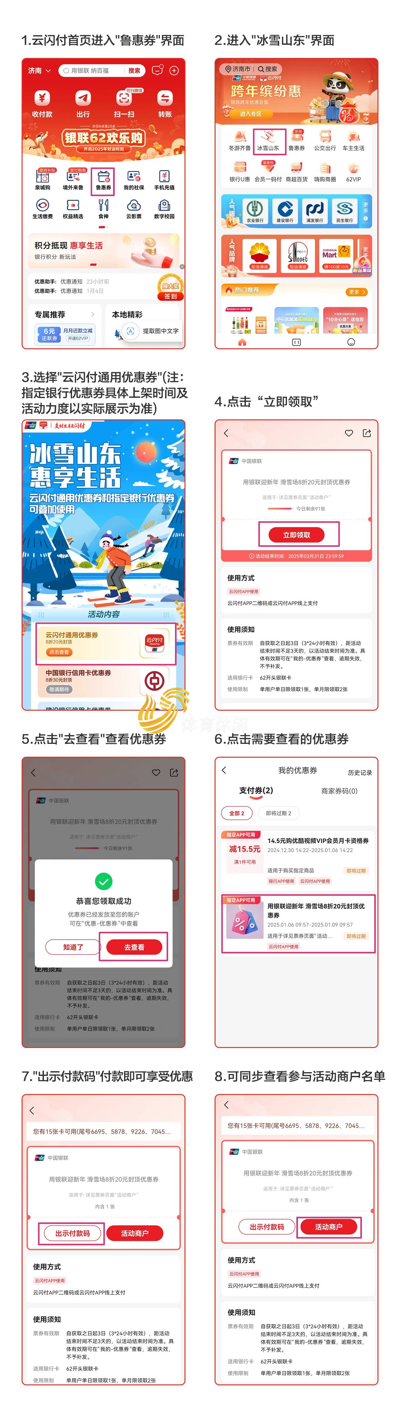 據悉,2025冰雪消費季活動將持續至2025年3月上旬,消費者可通過“雲閃付”APP領取“冰雪山東”優惠券,具體操作步驟如下: