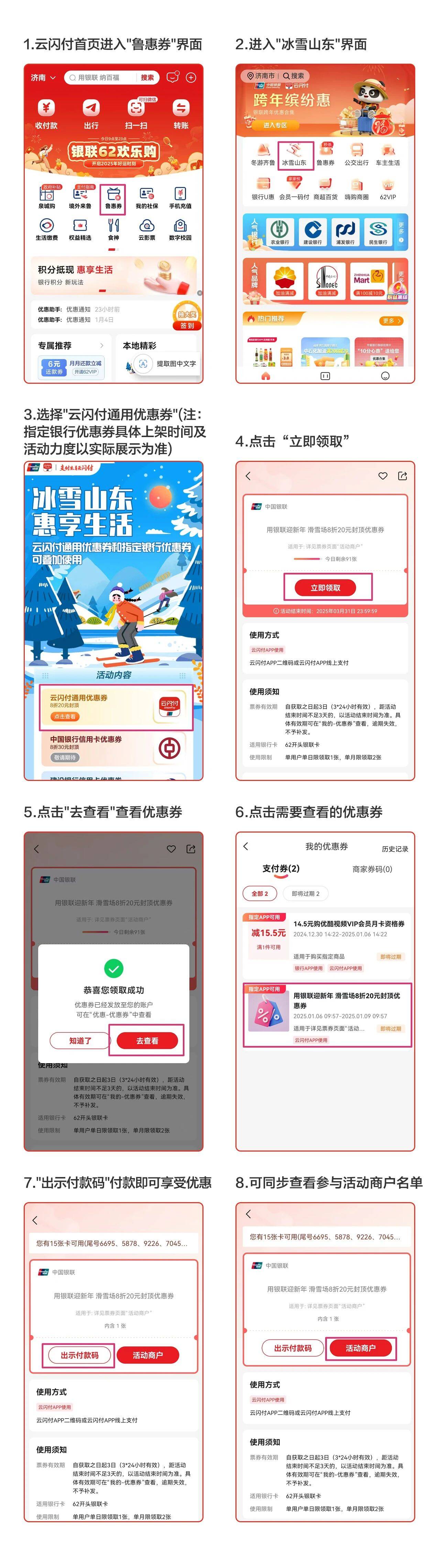 首先,大家需要下載雲閃付app,在首頁找到“魯惠券”,點擊進入“冰雪山東”。