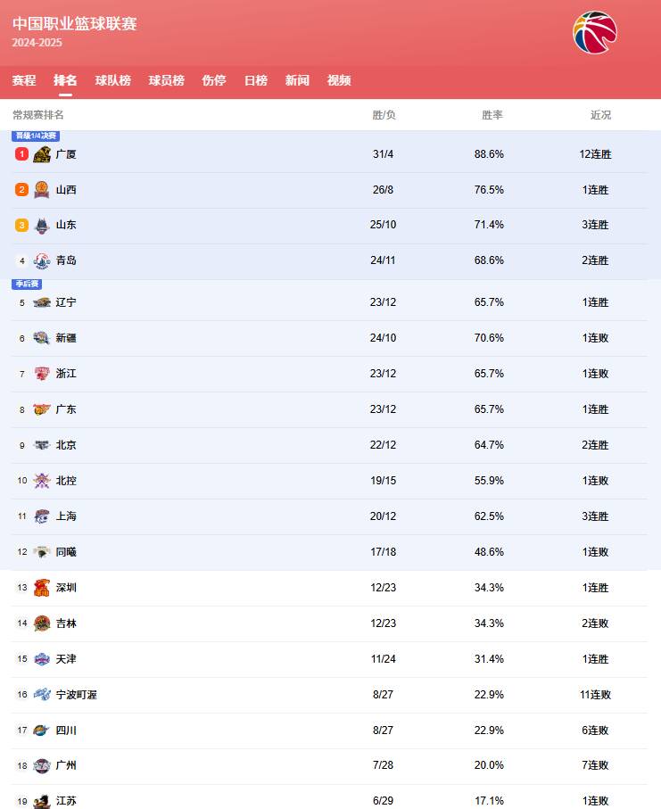 在積分榜上,廣廈男籃以31勝4負的驕人戰績遙遙領先,他們接連戰勝北京、遼寧和浙江等強隊,豪取12連勝,實力之強可見一斑。緊隨其後的是山西隊,本輪大勝江蘇後,戰績達到26勝8負,穩居第二。山東隊則在本輪比賽中逆轉擊敗北控,以25勝10負的戰績位列第三。