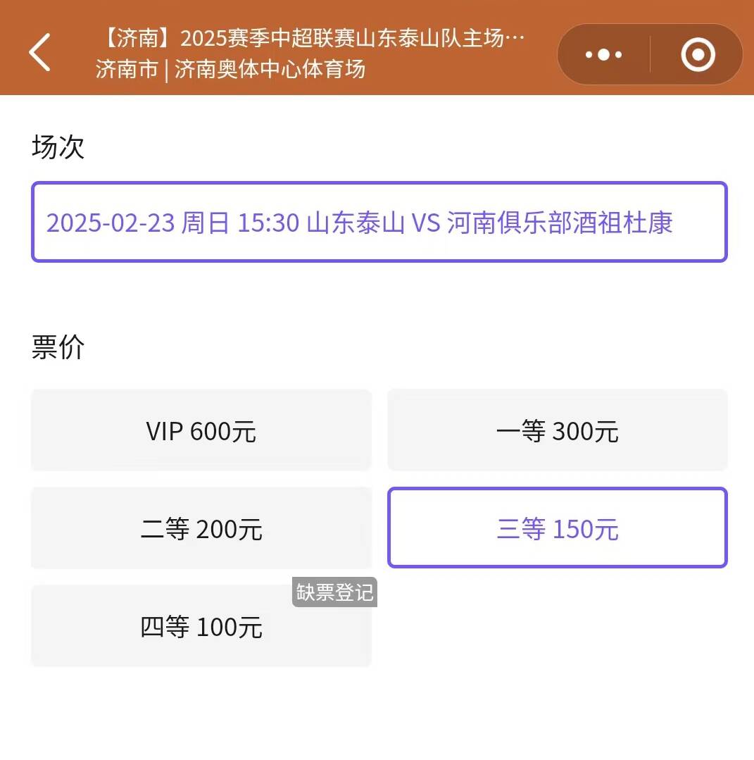 齊魯網·閃電新聞2月22日訊 閃電體育消息,日前,山東泰山隊官方發布23日對陣河南隊的票務公告,本場比賽最高票價600元,最低100元。