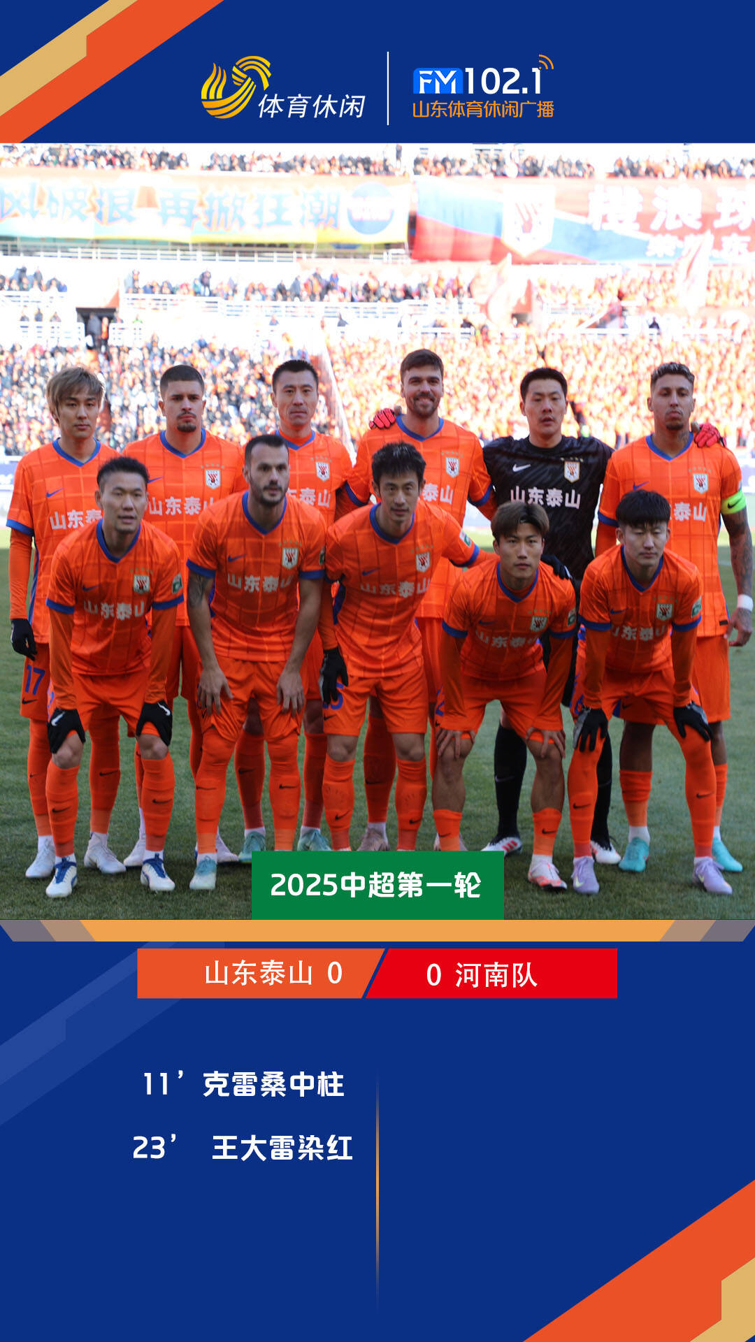 賽前,泰山隊管理層為三名新援卡紮爾、馬德魯加、李小恒頒發新賽季球衣。值得一提的是,泰山名宿宿茂臻以俱樂部副總經理的身份正式亮相。上半場比賽第21分鍾,王大雷衝出禁區出擊踢倒劉鑫瑜,通過VAR,裁判直接出示紅牌罰下王大雷,隨後門將於金永替補上場換下謝文能。第44分鍾,納薩裏奧外圍嚐試遠射偏出球門。上半場比賽結束,山東泰山主場0-0暫時戰平河南。