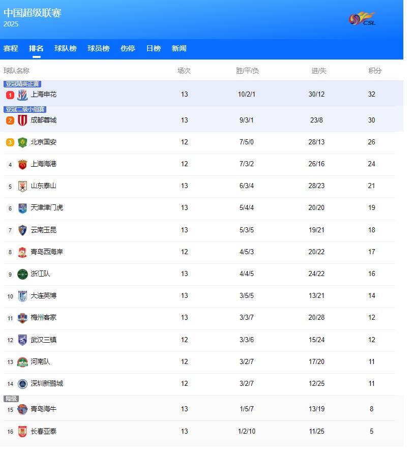 閃電體育5月19日訊 5月17日,中超聯賽第13輪戰罷。上海申花憑借高效進攻3-0擊敗大連英博,繼續領跑積分榜。而積分榜前列的多支球隊本輪集體放緩腳步,成都蓉城、北京國安、上海海港和山東泰山均未取得勝利。