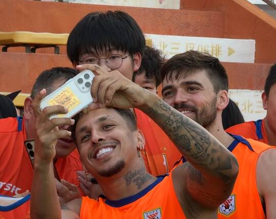 首次在訓練場接觸到球迷的澤卡在訓練結束後徹底玩High了,攜手克雷桑與球迷進行合影留念。