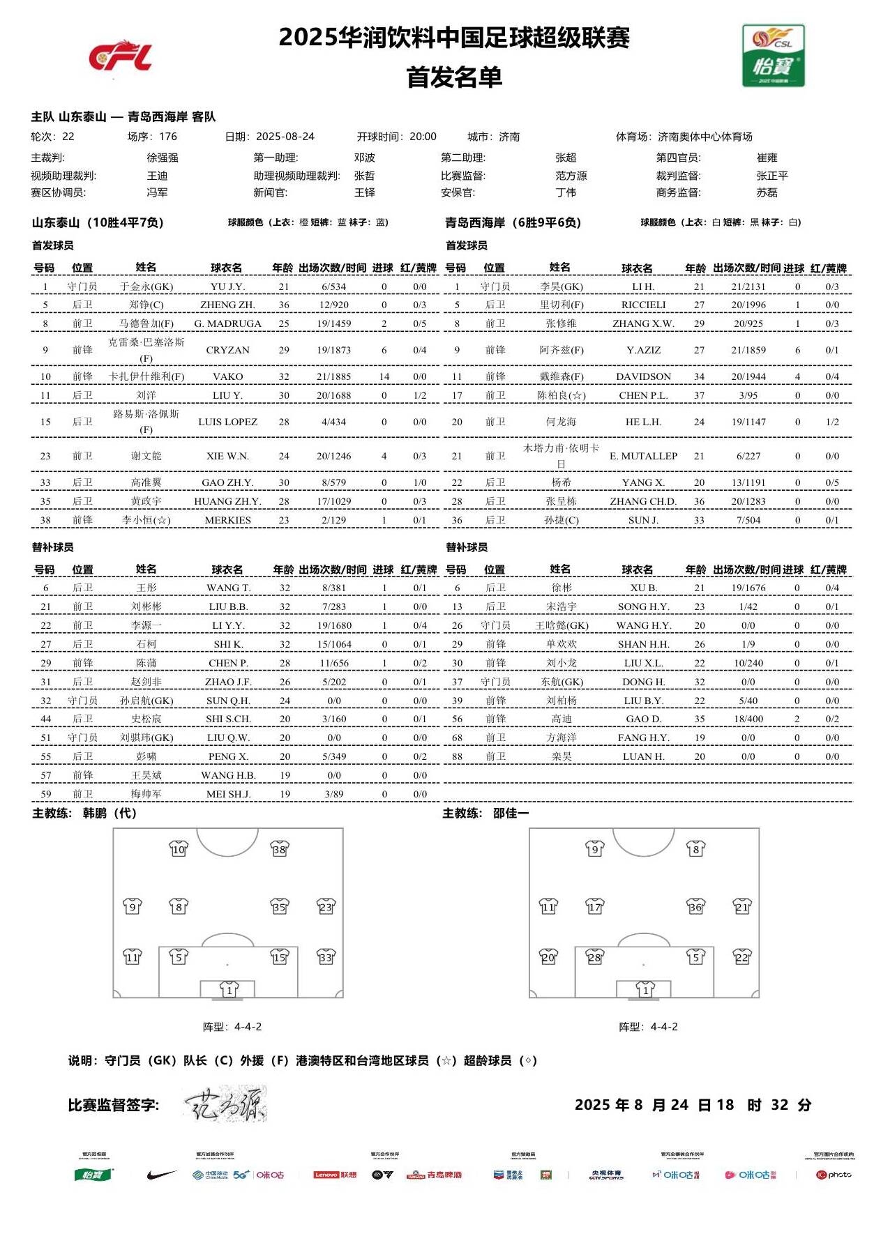 閃電體育8月24日訊 北京時間今晚20點,齊魯德比之戰,山東泰山主場迎戰青島西海岸,賽前首發陣容出爐。