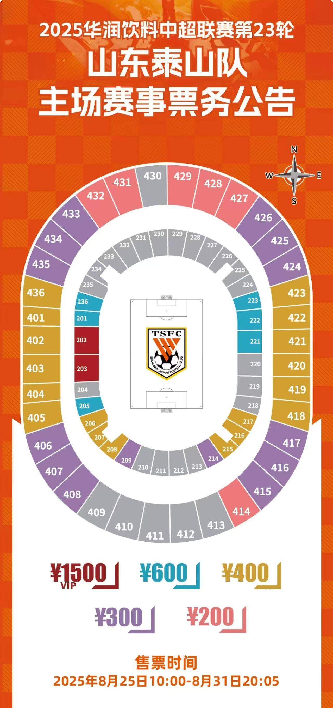 閃電體育8月26日訊 8月31日中超第23輪,山東泰山隊主場迎戰北京國安。本場比賽的球票昨日開始銷售,截至目前多個檔位球票顯示已經售罄。