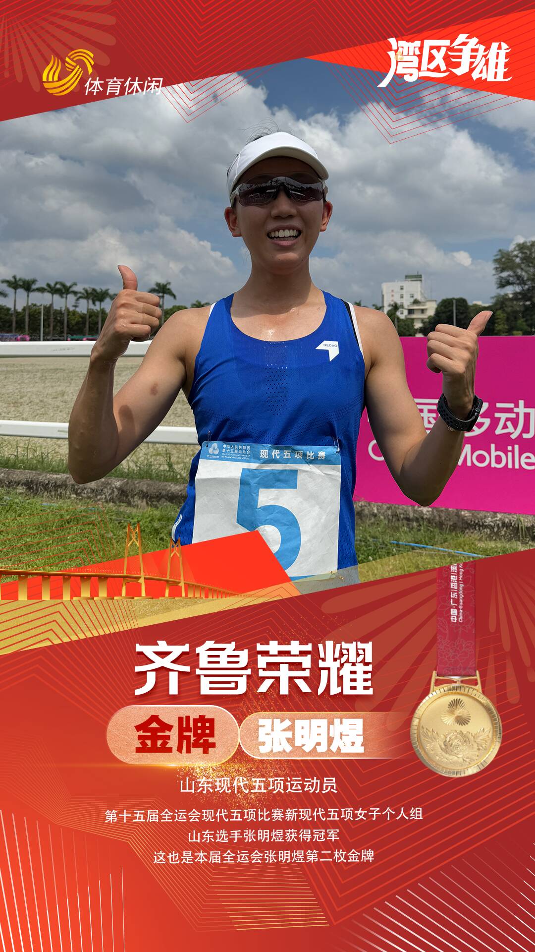 本次賽事, 山東共有四名運動員晉級新現代五項女子個人組決賽,分別是張明煜、齊悅彤、馬玉娟、以及劉易卓。賽前劉易卓在訓練中不慎受傷無奈退賽。決賽中兩名山東運動員張明煜和齊悅彤發揮出色,隨著擊劍、障礙、遊泳三項比完,齊悅彤位列第四,張明煜排名第五。在最後一項激光跑的比拚中,張明煜奮起直追,最後以總成績1447分逆轉奪得金牌。