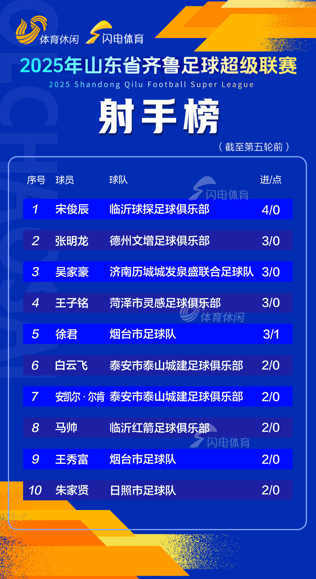 閃電體育10月9日訊 10月8日晚,齊魯超賽結束第四輪的爭奪,射手榜方麵,宋俊辰以4粒進球排名第一。