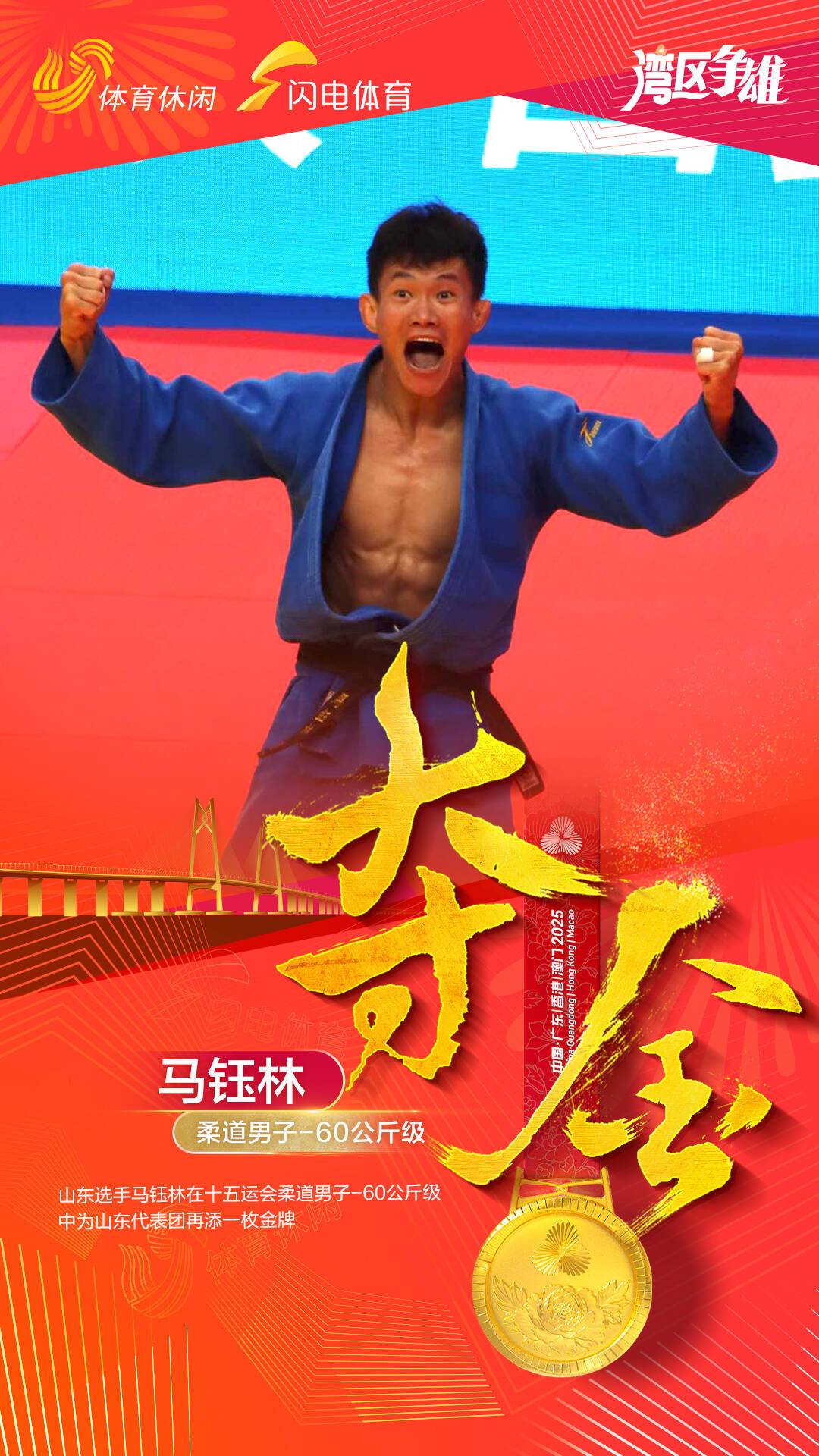 閃電體育11月10日訊 11月10日,十五運柔道首日比賽在肇慶四會市拉開戰幕,在男子-60公斤比賽中,山東馬鈺林戰勝江蘇選手王元濤獲得冠軍。