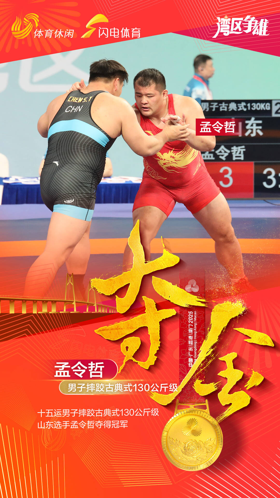 閃電體育11月14日訊 13日,十五運會摔跤項目收官,最後一場比賽是男子古典式130公斤級決賽,最終,山東運動員孟令哲獲得該項目金牌。