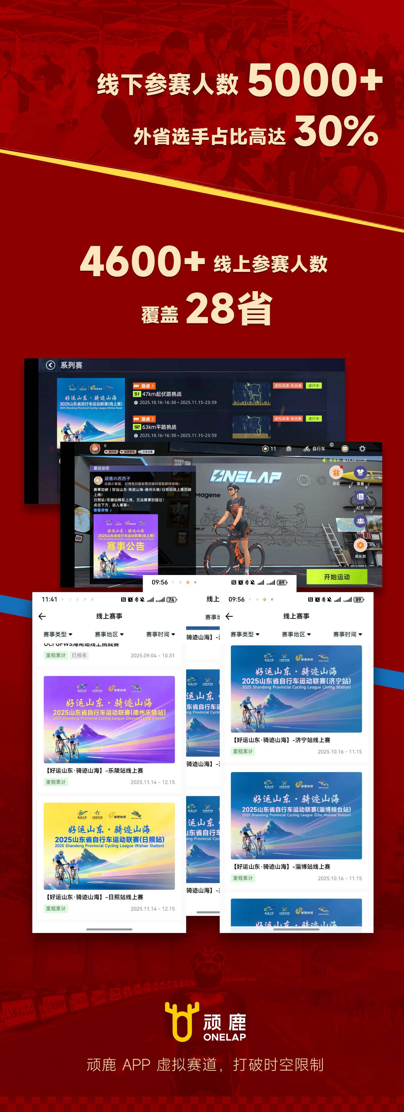 打破時空限製,聯賽構建的線下+線上賽雙軌模式,讓騎行熱情跨越山海。線下賽事吸引省內外選手5000人,其中外省選手占比達 30%,彰顯了賽事的全國性吸引力;線上依托頑鹿 APP 搭建虛擬賽道,從 4600 人的參賽規模來看,這種“無邊界”的參與模式,確實讓“好運山東騎跡山海”觸達了更廣泛的人群。”
