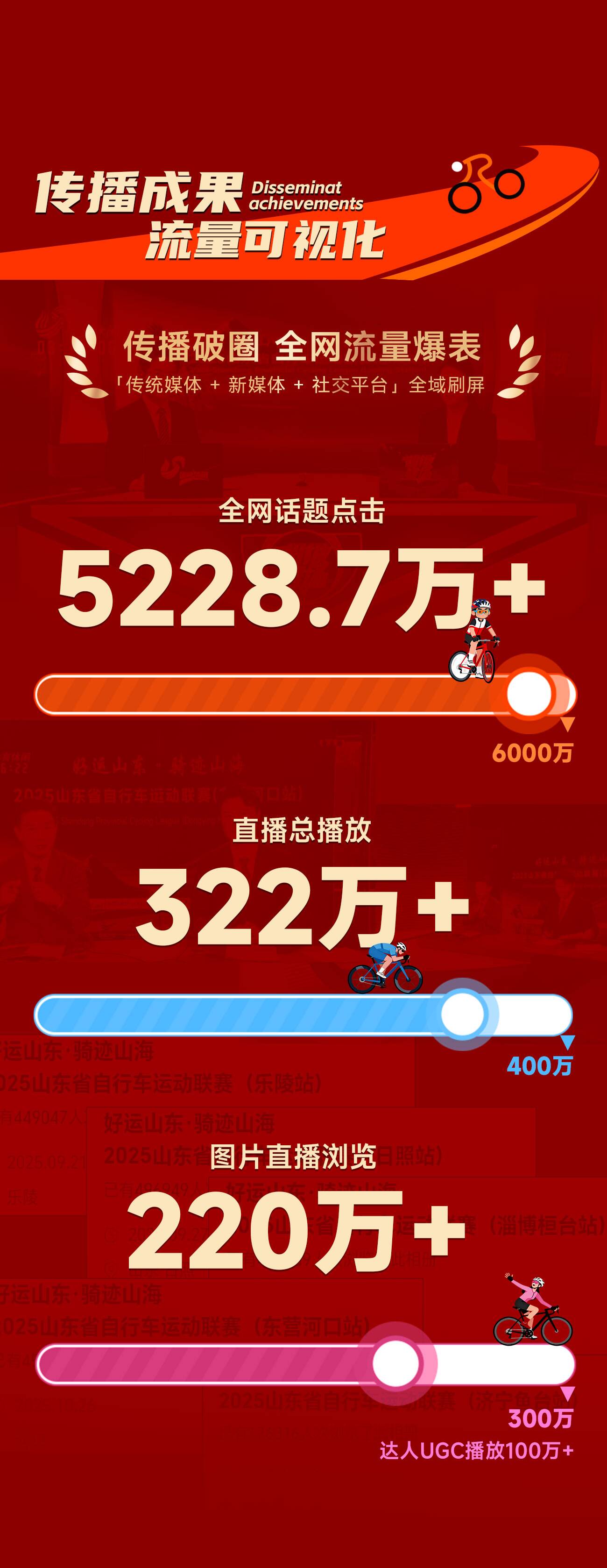 聯賽通過 “傳統媒體 + 新媒體 + 社交平台” 的全渠道傳播網絡,五站賽事累計傳播量破億,其中樂陵站、東營河口站單站直播時長150分鍾,全網總播放量達 322萬+,讓 “好運山東 騎跡山海” 從區域賽事 IP 成長為全國性騎行品牌。