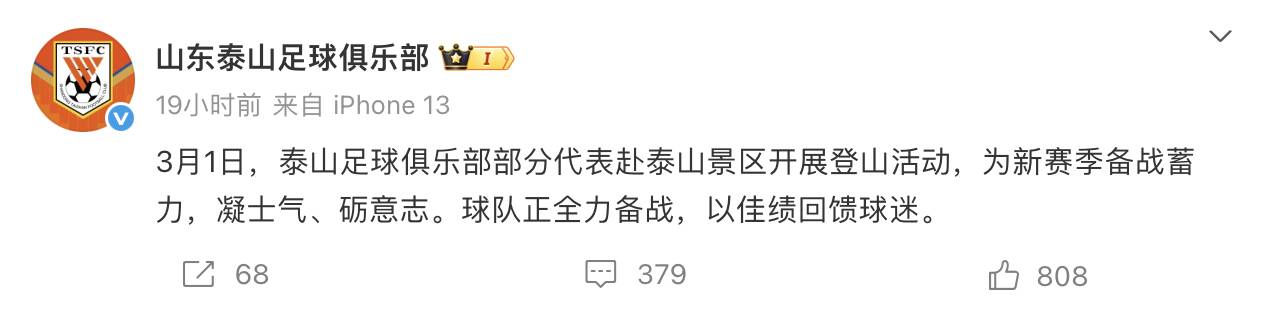 閃電體育3月2日訊 3月1日,山東泰山足球俱樂部部分代表前往泰山景區開展登山活動,為新賽季備戰蓄力,凝聚士氣、磨練意誌。俱樂部官方微博表示,球隊目前正全力投入備戰,力爭以優異成績回饋廣大球迷的支持。